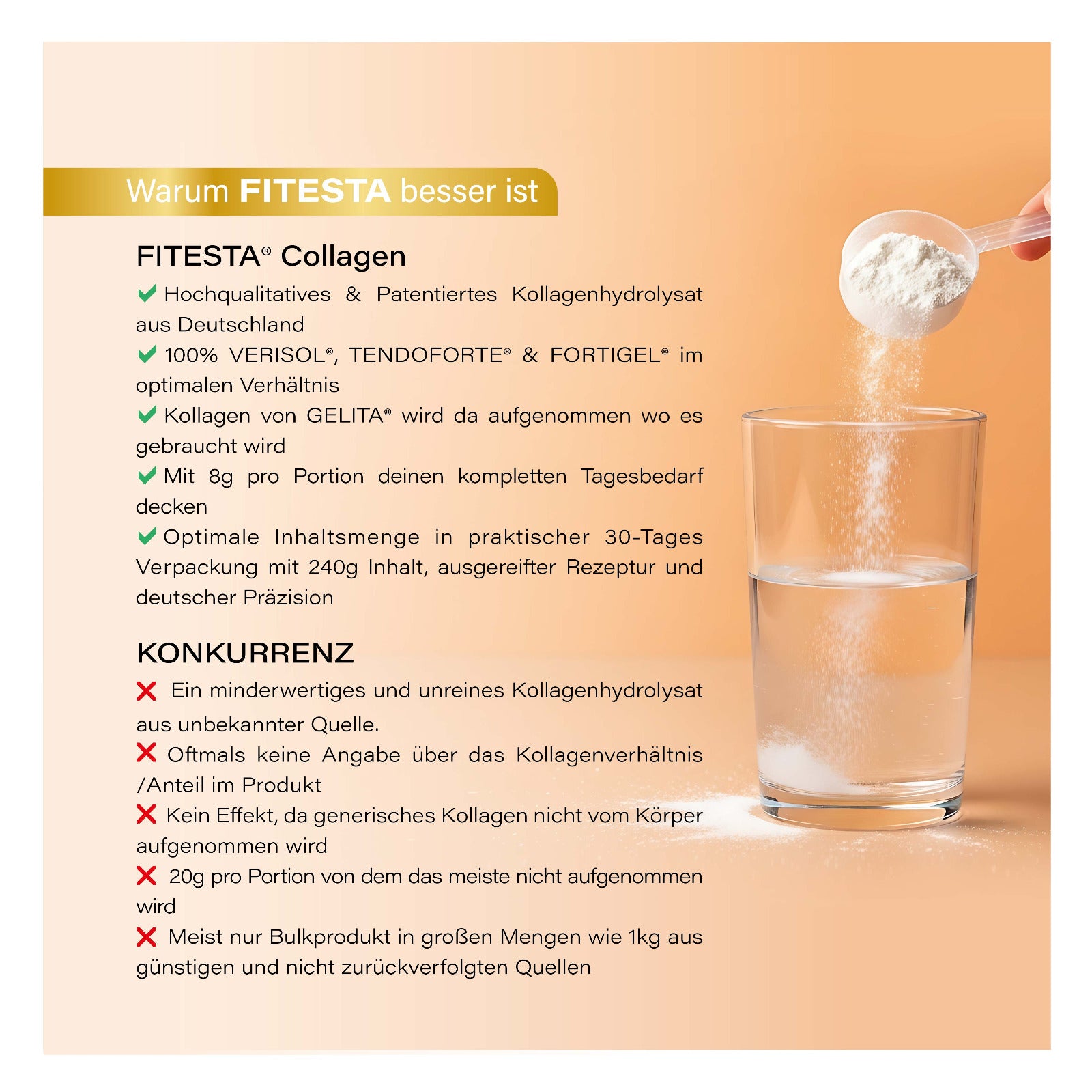 Kollagen ist ein wesentlicher Bestandteil des Körpers und spielt eine wichtige Rolle für gesunde Gelenke, stabile Knochen, Muskeln sowie für die Haut, Haare und Nägel. Mit Bioactive Collagen Complex von FITESTA® Health & Beauty erhältst du eine gezielte Unterstützung für die Förderung der natürlichen Kollagenproduktion. Die Bioactive Collagen Peptides (BCP®) von GELITA, in den Reinformen VERISOL®, TENDOFORTE® und FORTIGEL®, wurden speziell entwickelt, um die Kollagenbiosynthese im Körper anzuregen und so zur Erhaltung von Haut, Haaren und Nägeln beizutragen.