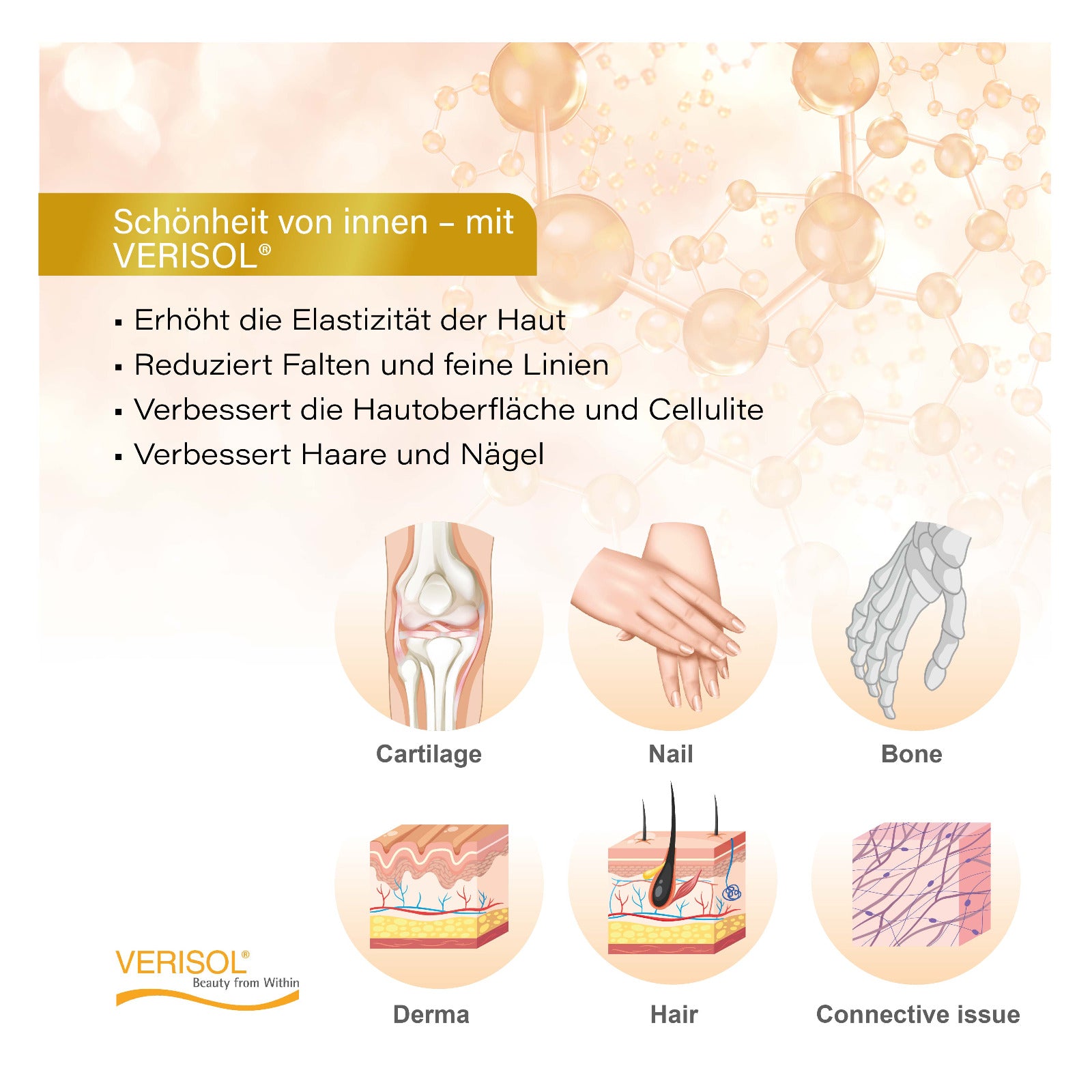 Kollagenhydrolysat (Rind), Emulgator: Lecithine (Sonnenblume); L-Ascorbinsäure, Zinkbisglycinat, DL-alpha-Tocopherylacetat, Nicotinamid, Retinylacetat, Kupfergluconat, D-Biotin.